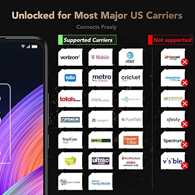 • Unlocked Smartphone - The TCL 30XL works with most major U.S. carriers, including Verizon, AT&T and T-Mobile. This android phone is also compatible with Tracfone, Straight talk, Metro PCS, Simple Mobile, Cricket, Ultra Mobile, H2O, Tello, Consumer Cellular, RedPocket (Only GSMA network), Pure talk, Viya, etc. This cell phone isn't compatible with Visible or CDMA networks, such as Assurance wireless, Spectrum, Xfinity, Boost Mobile, etc.
