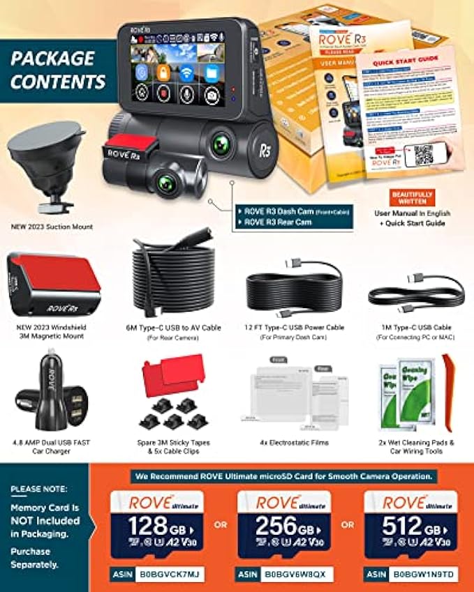 • 【The Hardwire Kit for R3 and Recommended Memory Cards】The Correct Hardwire kit for ROVE R3 is ASIN: B0B7235VLX. We strongly recommend ROVE Ultimate Micro SD Cards ASIN: B0BGV6W8QX
