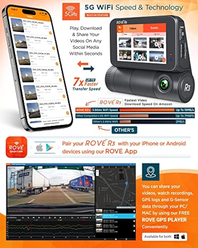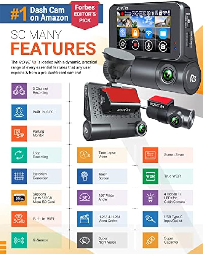 • 【Let's talk about all the bells and whistles】Here we go, It's got 3" IPS touch screen, 3 channel recording front + cabin + rear, the all-new 2022 ROVE APPs for iOS and Android, remote firmware updates, always ON dual-band 5.0 GHz and 2.4 GHz built-in WiFi for super-fast transfer speed, Built-In GPS for live speed, compass, and location stamps, proprietary fail-safe voice guidance, supercapacitor offers safety and longer product life unlike other internal battery dash cams.