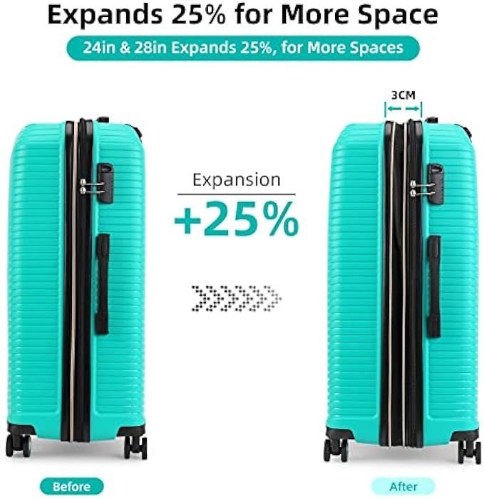 • 5 Piece Luggage Sets: 28inch, 24inch (ONLY 28inch and 24inch are expandable, adding 25% space capacity for hardshell luggage),18inch, 20inch and 24inch luggage is perfect for business and personal travel, 14inch suitcase can store can store toothbrush,wallet,makeups,etc.