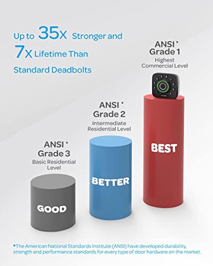 Certified Highest Security and Durability: ANSI Commercial Grade 1. Proven for up to 35 times strength of standard residential locks along with a 7 times longer lifespan. IP65 rated dust and weatherproof external Smart Lock built to withstand heat and cold.