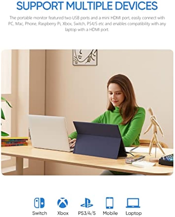 • [Wide Compatibility] The portable monitor is widely compatible with various ports and devices and there is no need of any app or driver, you just need to plug and play and its ready to use. The dual ports USB-C and HDMI can be easily connected to laptop, PC, Mac, Raspberry Pi, Phones, XBOX, PS3, 4, 5 and Switches.