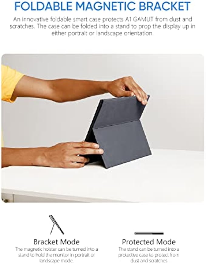 • [Durable Quality and Smart Cover] High-Quality and durable metal materials are used to make this portable monitor that shows a fine metal texture and high strength. The monitor also includes a magnetic leather smart cover which provides protection for the entire screen and can also be folded into a stand to act as monitor support.