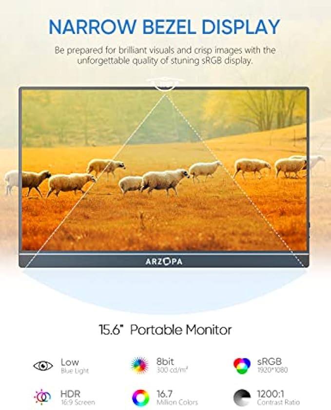 • [Full HD 1080P IPS Screen] Designed with Full HD, 1920 x 1080 resolution IPS screen, the ARZOPA portable monitor offers a vivid image with accuracy and a 178° full viewing angle.