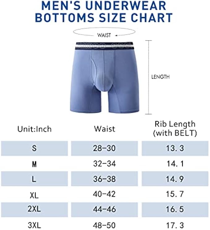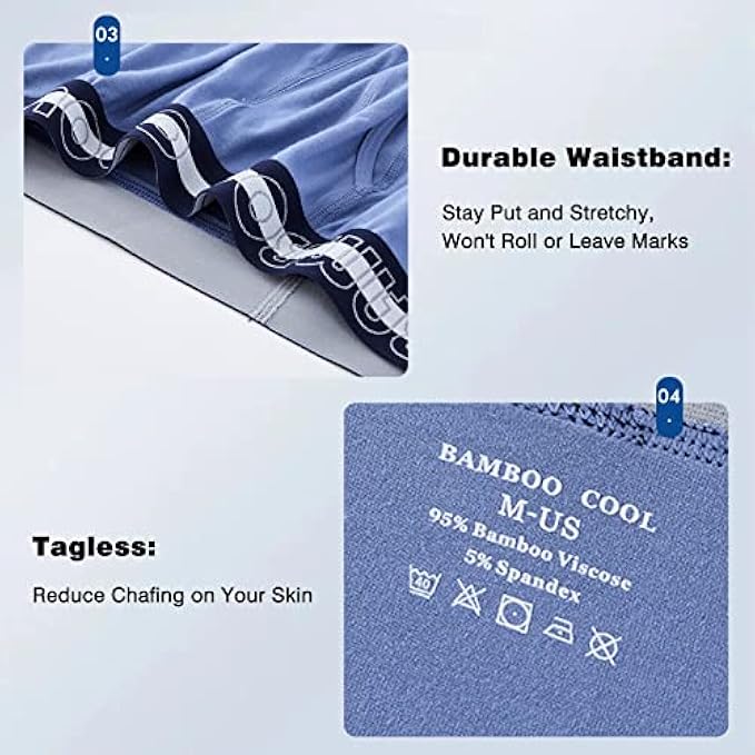 <li class="a-spacing-mini"><span class="a-list-item"> Bamboo Viscose </span></li> <li class="a-spacing-mini"><span class="a-list-item"> Imported </span></li> <li class="a-spacing-mini"><span class="a-list-item"> Machine Wash </span></li> <li class="a-spacing-mini"><span class="a-list-item"> FABRIC COMPOSITION - These mens underwear made of bamboo viscose and elastic spandex, it is silky, smooth and healthy, won't irritate the skin and won't deformed or fade by washing. Our bamboo boxer briefs refuse to be sultry, breathe freely and feature moisture-wicking due to its unique material. </span></li> <li class="a-spacing-mini"><span class="a-list-item"> ONE PIECE CLEAN CUT - Just like the second layer of skin to meet the picky requirements of the butt for comfort. You won't get foreign body sensation and it can reduce the friction during exercise, no matter what kind of clothing you wear like sweatpants or professional suits won't reveal the traces. </span></li> <li class="a-spacing-mini"><span class="a-list-item"> CHARMING DETAILS - 3D U-pouch with open fly provides extra roomy for men's private parts without extrusion or constraint. Tagless design brings all days and nights comfort. No riding-up design of boxer briefs for men hugs your leg, super soft and flexible, no rolling or gathering, easy to put on and take off. Plus, the logo waistband with sporty sense makes you look more energetic. You'll be more charming and confident in wearing our underwear. </span></li> <li class="a-spacing-mini"><span class="a-list-item"> TRUE TO SIZE - Bamboo cool underwear for men provide different colors, different combinations, give you a different color to everyday life. These underwear for men pack are made in US Standard Size, Small=28" - 30",Medium=32" - 34",Large=36" - 38",X-Large=40" - 42",XX-Large=44" - 46", 3X-Large=48" - 50". This mens underwear boxer briefs pack is the one must have as basic essential in your wardrobe or the fantastic gift. </span></li> <li class="a-spacing-mini"><span class="a-list-item"> SATISFACTION GUARANTEE - We will responding you within 24 hours if you have any questions with our mens underwear. If you are not 100% satisfied with our bamboo underwear men, we’re more than happy to offer you 100% full money-back/replace/exchange within 30 days. We listen to your feedback from our customer and fine-tune every details to ensure quality and fit. </span></li>