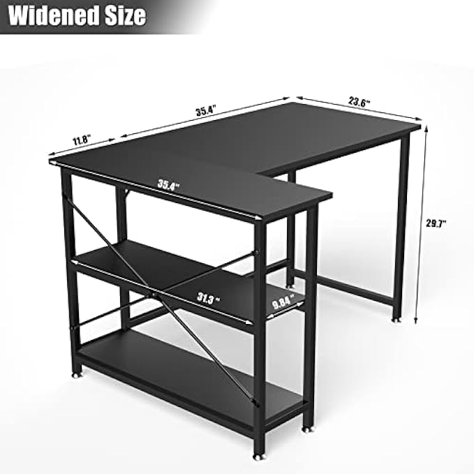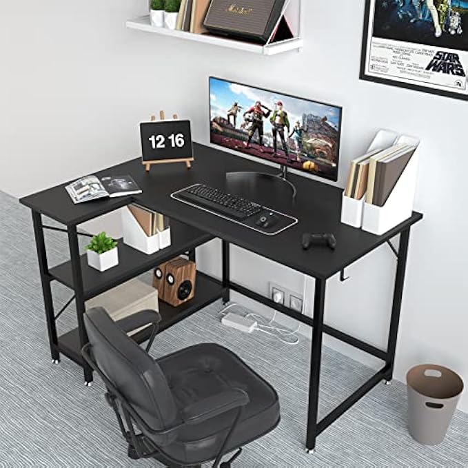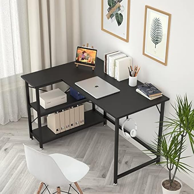 Pyraxis L Shaped Computer Desk, 47 Inch Gaming Desks with Hooks, Corner Desk with Storage Shelves, Office Desk for Small Space, Reversible Desks for Home Office, Black