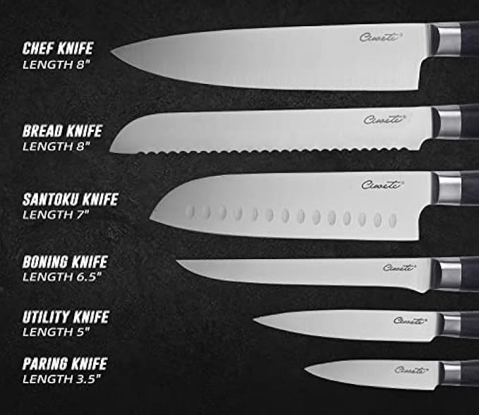 ?Value Knife Set - 6-piece knife set includes 8" chef knife, 8" bread knife, 7" santoku knife, 6.5" boning knife, 5" utility knife, 3.5" fruit knife, which can handle most everyday kitchen tasks.