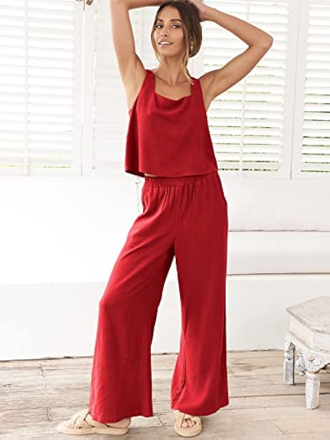 <li class="a-spacing-mini"><span class="a-list-item"> 30% Linen + 70% Rayon </span></li> <li class="a-spacing-mini"><span class="a-list-item"> Imported </span></li> <li class="a-spacing-mini"><span class="a-list-item"> Pull On closure </span></li> <li class="a-spacing-mini"><span class="a-list-item"> Dry Clean Only </span></li> <li class="a-spacing-mini"><span class="a-list-item"> Size - S=US(2-4), M=US(6-8), L=US(10-12), XL=US(14-16),XXL=US(18-20). </span></li> <li class="a-spacing-mini"><span class="a-list-item"> Features - Elevate your summer wardrobe with this cute 2 piece outfit! Adorned with a square neck sleeveless crop top and elastic high waist wide leg ankle length pants with pockets. </span></li> <li class="a-spacing-mini"><span class="a-list-item"> Occasion - Perfect for a variety of occasions including summer parties, vacations, family gatherings, and casual outings. A must-have addition to your modest wardrobe. </span></li><li class="a-spacing-mini"><span class="a-list-item">Cute Outfits Set - Made from high-quality lightweight fabric, this outfit offers a comfortable wearing experience. Its versatile design makes it perfect for the beach or a day out, and even for workouts or lounging at home.</span></li> <li class="a-spacing-mini"><span class="a-list-item">Care - To keep your outfit looking its best, we recommend dry cleaning to avoid shrinkage.</span></li>