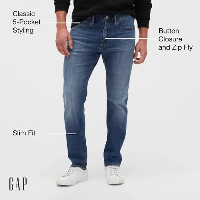 <li class="a-spacing-mini"><span class="a-list-item"> 69% Cotton, 27% Polyester, 3% Rayon 1% Elastane </span></li> <li class="a-spacing-mini"><span class="a-list-item"> Imported </span></li> <li class="a-spacing-mini"><span class="a-list-item"> Pull On closure </span></li> <li class="a-spacing-mini"><span class="a-list-item"> Machine Wash </span></li> <li class="a-spacing-mini"><span class="a-list-item"> THE PERFECT SLIM FIT: Cut slim throughout, these jeans are made from super soft premium denim with GapFlex stretch technology that’s engineered to upgrade your comfort and elevate your every day </span></li> <li class="a-spacing-mini"><span class="a-list-item"> CLASSIC DETAILS: Each pair features five-pocket styling, a button closure, and a heavy duty zipper fly </span></li> <li class="a-spacing-mini"><span class="a-list-item"> SIZES FOR ALL: Gap jeans are made for every body and are available in a wide range of fits, sizes, washes, and styles </span></li><li class="a-spacing-mini"><span class="a-list-item">BETTER DENIM FOR A BETTER PLANET: This pair of denim pants is part of our water conserving Washwell program dedicated to finding more responsible ways to creating the styles we all know and love</span></li> <li class="a-spacing-mini"><span class="a-list-item">AMERICAN STYLE FOR ALL AGES: Gap champions a uniquely American sense of style with apparel that bridges the gaps between individuals, generations, and cultures</span></li>