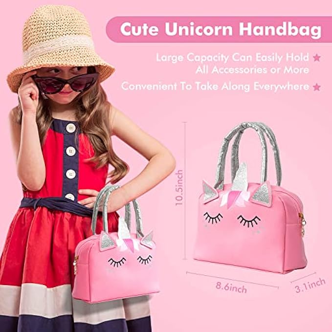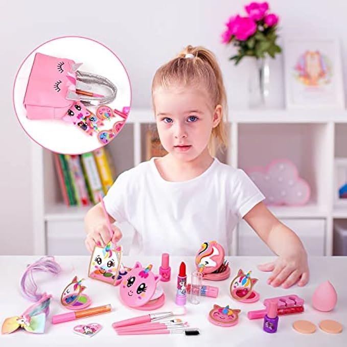 • THE UNIQUE AND CUTE UNICORN DESIGN: This kids makeup kit for girl is specially combined with the cute cartoon unicorn theme, it is a great choice for little girls who like unicorn kids makeup kit. The large capacity makeup bag can easily hold all the cute makeup accessories and another things, which is convenient for going out to participate in makeup parties and princess role-playing games.