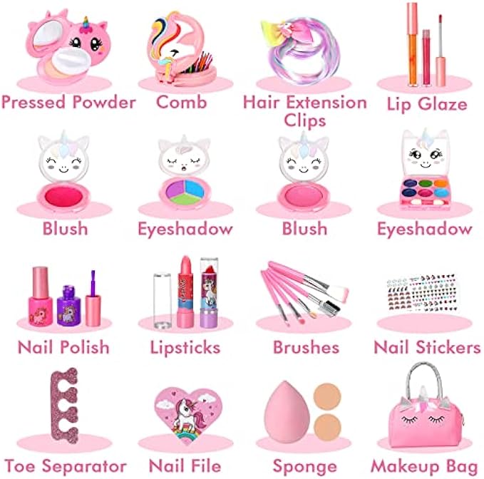 • SUPER VALUE ALL IN ONE KIDS MAKEUP KIT: 2*Lipsticks (Red + Pink), 1*Pressed Powder, 2*Blush, 2*Eyeshadow(9 Colors), 2*Lip Glaze, 3*Sponge, 1*Folding Comb, 2*Nail Polish, 2*Cute Nail Stickers, 1*Toe Separator, 1*Nail File, 5*Makeup Brushes, 1*Rainbow Colored Hair Extension Clips And 1*Makeup Bag. Portable all in one rich real washable kids makeup kit for girls to satisfy children's curiosity and needs for makeup, the perfect choice for little princess makeup kit.