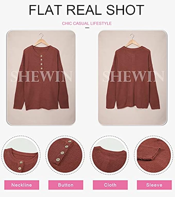 <li class="a-spacing-mini"><span class="a-list-item"> 55% Acrylic, 45% Cotton </span></li> <li class="a-spacing-mini"><span class="a-list-item"> Imported </span></li> <li class="a-spacing-mini"><span class="a-list-item"> Pull On closure </span></li> <li class="a-spacing-mini"><span class="a-list-item"> Hand Wash Only </span></li> <li class="a-spacing-mini"><span class="a-list-item"> Material: SHEWIN Fashion sweaters made with breathable skin-friendly fabric,comfortable and skin-friendly,gives you soft and comforatble feeling. </span></li> <li class="a-spacing-mini"><span class="a-list-item"> Feature: Oversized, Waffle Knit, V Neck, Solid Color, Pullover, Long Sleeve, Batwing, Front Button Closures, Side Slits, Hneley tops, Loose Fit Sweaters. </span></li> <li class="a-spacing-mini"><span class="a-list-item"> Occasion: Fashion fall winter sweater shirts is easy to pair it with skinny leggings,jeans,pants,boots for a simple and fashionable look.Suitable for Casual,daily life,work, office, party, date, vacation and any other occasions in Spring and Winter. </span></li><li class="a-spacing-mini"><span class="a-list-item">Match: You can pair this fashion sweater with variety of coats, jacket, jeans, denim shorts, skirts, leggings, sneakers or heels to complete a simple and fashionable look.</span></li> <li class="a-spacing-mini"><span class="a-list-item">Size: S/M/L/XL/XXL for Choice. US SIZE: S=(US 4-6), M=(US 8-10), L=(US 12-14), XL=(US 16-18), 2XL=(US 18-20). We use American standard size.Please Refer to the SHEWIN Size Chart before Ordering. Any other questions, please contact us directly!</span></li>