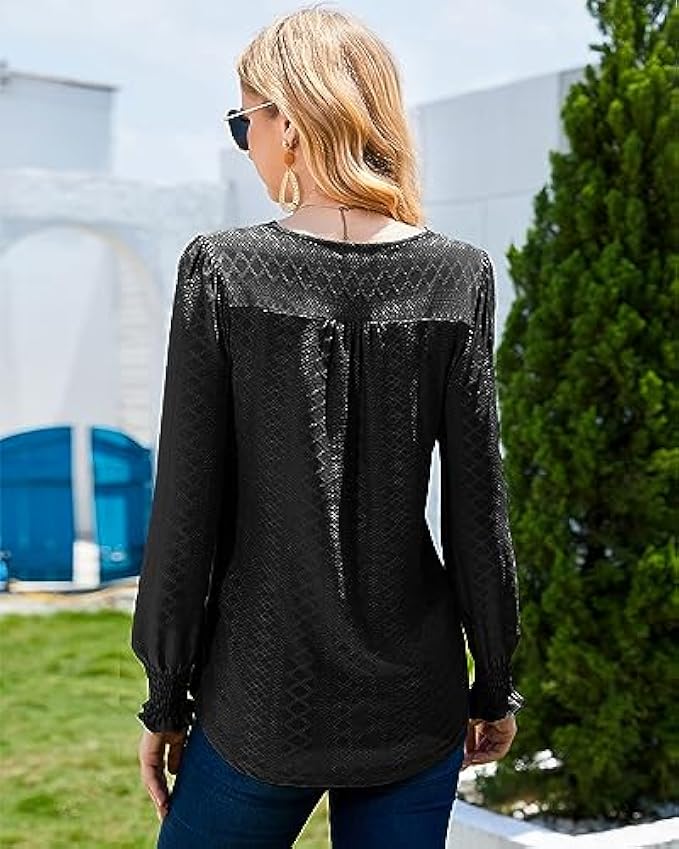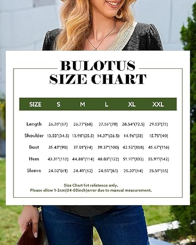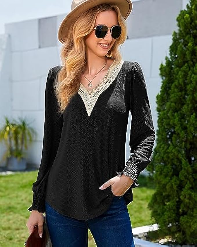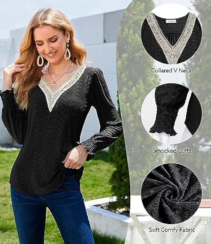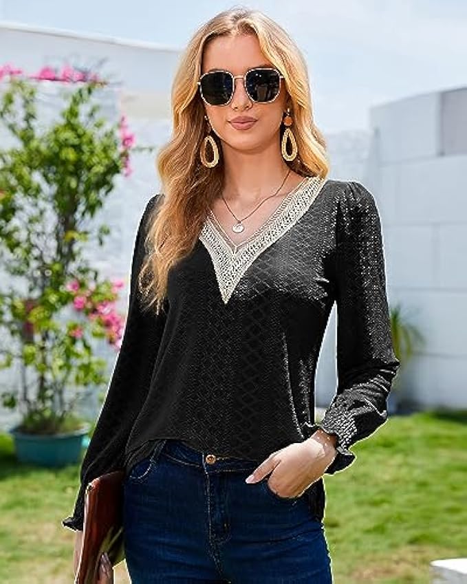 <li class="a-spacing-mini"><span class="a-list-item"> 95% Polyester, 5% Spandex </span></li> <li class="a-spacing-mini"><span class="a-list-item"> Imported </span></li> <li class="a-spacing-mini"><span class="a-list-item"> Pull On closure </span></li> <li class="a-spacing-mini"><span class="a-list-item"> Hand Wash Only </span></li> <li class="a-spacing-mini"><span class="a-list-item"> ❤【Unique & Comfy Material】: This dressy casual blouses is made of eyelet material combine with lace trim. The eyelet tops is breathable, lightweight, soft, comfortable, stretchable, and not clingy. You will feel comfortable and stylish wearing this women's blouse </span></li> <li class="a-spacing-mini"><span class="a-list-item"> ❤【Features】: Women's long sleeve shirts feature sexy lace crochet v neck cuts that reveal the collarbone, adding a bit of boho style. Ingenious elastic smocked cuffs and small folds on the shoulders hide the flesh on the arms, outlining the most slender wrist lines, adding more femininity to this ladies tops and making you look more elegant and stylish </span></li> <li class="a-spacing-mini"><span class="a-list-item"> ❤【Match】: This loose fit tunic tops is the perfect length to wear with leggings or jeans, and an excellent choice to pair with shorts, skirts, heeled sandals, and boots or sneakers, creating 2023 trendy and fashionable looks. Our business casual tops are also perfect for layering and adding a touch of elegance to any outfits </span></li><li class="a-spacing-mini"><span class="a-list-item">❤【Occasion】: This long sleeve blouses is suitable for spring, fall and winter. This elegant lace v neck tops is extremely versatile for any occasion. It is perfect for office, work, business, going out, shopping, holiday, dating, party or casual daily wear. You will receive a lot of praise for this long sleeve shirt!</span></li> <li class="a-spacing-mini"><span class="a-list-item">❤【Customer Satisfaction is Always Our Top Priority】: To make sure you're happy with your order, check out the Size Chart we gave you in the product description (Not Amazon's). Bulotus Customer Support Team can answer all your questions about tops and blouses at any time</span></li>
