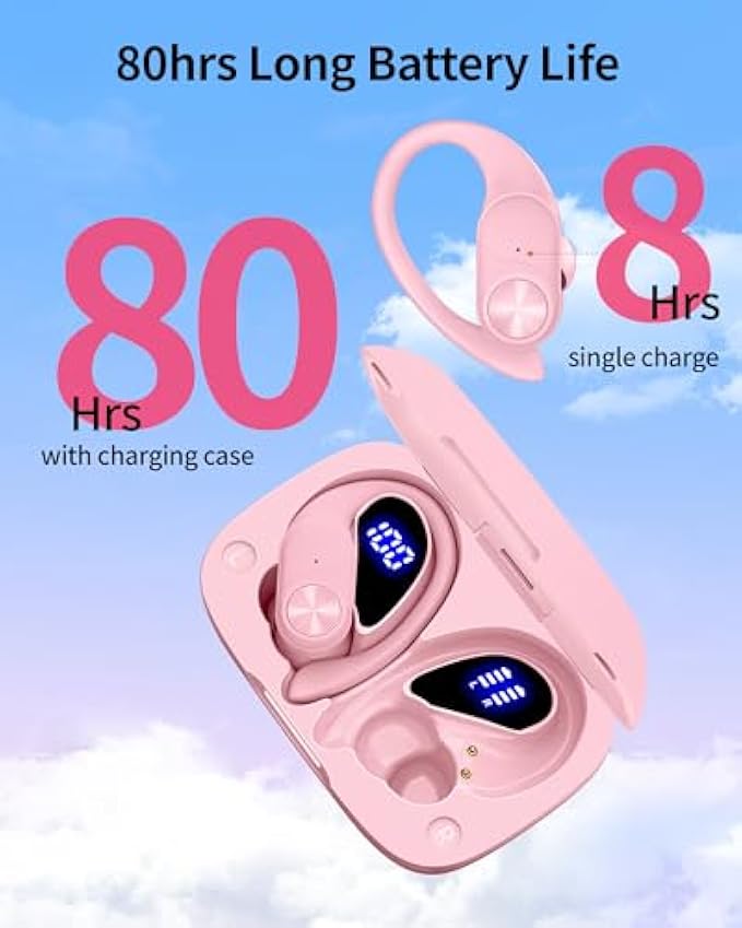 Bluetooth Headphones Wireless Earbuds 80hrs Playtime Wireless Charging Case Digital Display Sports Ear buds with Earhook Premium Deep Bass IPX7 Waterproof Over-Ear Earphones for TV Phone Laptop Pink