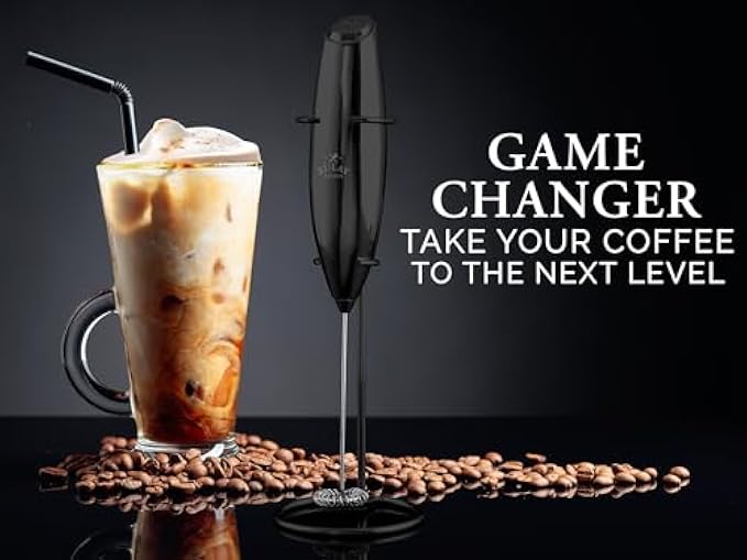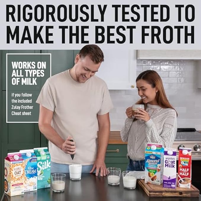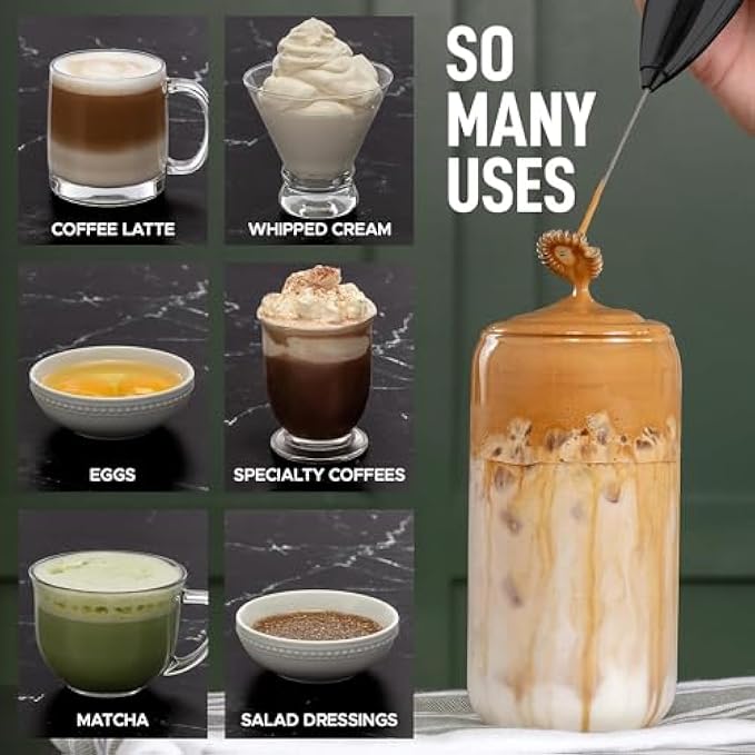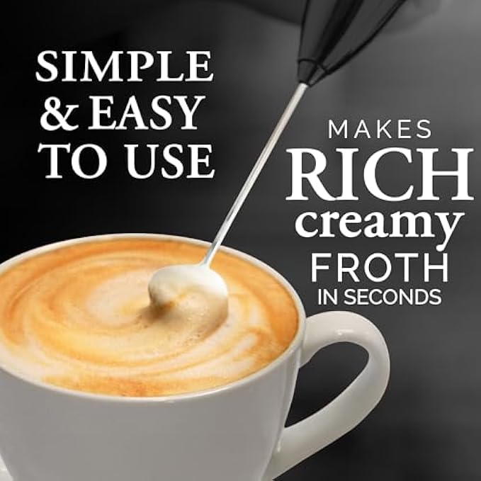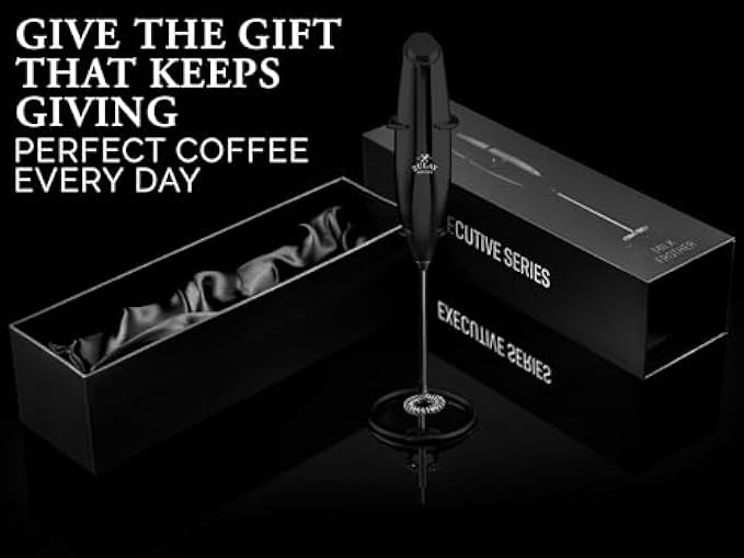 EXECUTIVE SERIES PREMIUM MILK FROTHER: Surprise your loved one with this special milk frother that comes in an elegant box, making it a perfect gift for every coffee lover. Make creamy delicious froth for your drinks at home without a trip to a coffee shop with your own electric whisk. Place this handheld frother on the included stand and let the radiant UV finish add shine to your coffee corner. MAKE RICH, CREAMY FROTH IN SECONDS: This electric milk frother has got your back when you're in a rush and still need a perfect coffee. It is built with a 13,000 RPM titanium moton and 25 spiral rings to add that velvety richness to your drink in seconds. Save a trip to a coffee shop and make the best latte, cappuccino, macchiato, hot chocolate, or matcha at home with this milk foamer. EASY TO CLEAN AND STORE: Cleaning this hand frother is super simple. Place the whisk under running water and briefly turn it on; wipe the handle with a damp cloth. This electric whisk can be displayed next to your coffee accessories with the included stand or carried in the bag to make frothy coffee anywhere, anytime. MATCHA MIXING, COFFEE & MORE: This electric matcha whisk works better than a manual bamboo whisk for making matcha tea and works just as well for coffee. It works perfectly for mixing nutritious protein powder with no additional container, blender or bottle shaker to wash. Use our electric mixer for all your whisking and mixing needs. Give healthy shakes and smoothies a kick by adding powder or eggnog flavor and mixing. PROVEN AND TRUSTED QUALITY: Built with a rust-resistant stainless steel whisk and a sleek nylon body, this durable coffee stirrer will be there for you whenever you need barista-style coffee at home. Whisk most types of milk, such as half and half, soy, almond, oat, cashew, hazelnut, whole milk, low-fat, skim milk and also whipping cream, with this drink mixer. It is powered by 2 x AA batteries (not included) HASSLE-FREE, ZULAY GUARANTEE: We love and take pride in our milk foamer and back it up with a lifetime guarantee. If there are any issues, just contact us, and we will make it right. Add some frothy goodness to your day with Zulay!
