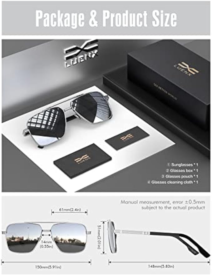 • [ GIFT PACKAGE & LIFETIME SUPPORT ] ▶ Including Sunglasses*1 / Soft glasses pouch*1 / Glasses cloth*1 / Packaging carton*1 . All LUENX customers enjoy 30 Days Money Back Guarantee; And that goes with a lifetime support! Just send us a message through Amazon.