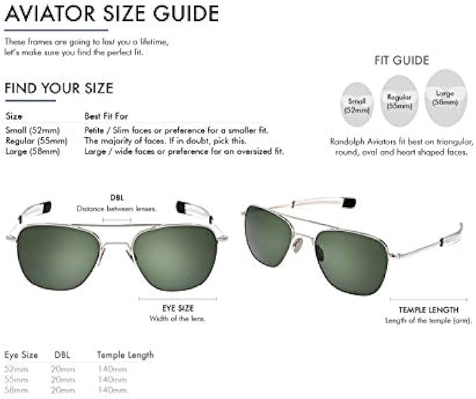 • HOW TO FIND YOUR SUNGLASS SIZE: Looking in a mirror, hold a ruler horizontally across your face. Measure in inches the distance between your left and right temples. 52mm = 5”, 55mm = 5.25”, 58mm = 5.75” Measuring above 58mm? Check out our Archer which is perfect for large or wide heads.