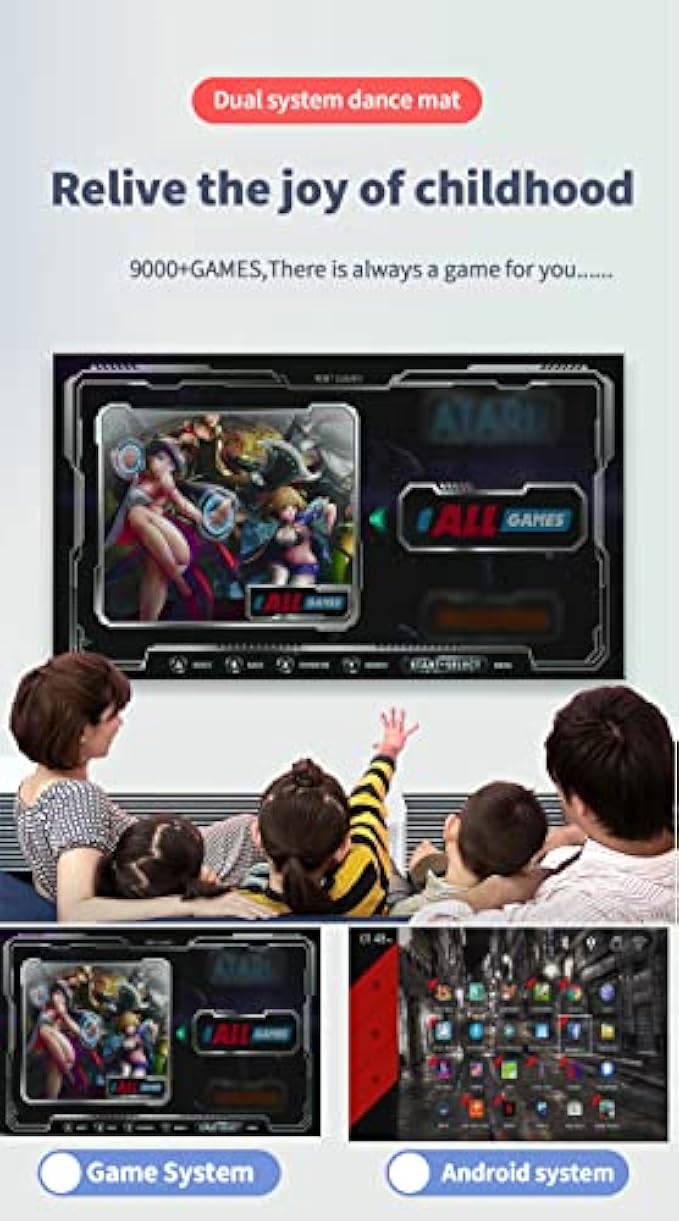 【Dual system dance carpet】Game system + Android system to switch freely, Android system can dance, running, playing ball, watching HD movies, has been pre-installed Youtube, Netflix, Facebook, Chrome and other popular applications, to home plug and play, no need to download, game system built-in 9000 + popular games, there is always one for you! 【Plug-and-play dance game】That connects to your TV via HDMI input. The upgraded chip provides stable and high quality video output. No more flashing black screen. HD video output brings you a better audiovisual experience, open Android system, supports installation of third party APP. 【Dual Game Handle + Dual Body Handle】The upgraded dance mat has more than 9000 games that you can play with your child to complete parent-child interaction, play ball, run, and dance together to bring you and your child closer together, and also exercise your child's reaction and body coordination skills. Whether you are dancing or playing a fun game, you will find many features on the OZLET dance mat. Both handles/controllers can be used together or separately. 【64G memory card + more than 9000 games】, the product is equipped with a large 64G memory card, built-in more than 9000 games, support more than ten popular simulators, so you can relive the joy of childhood, you can also play with your children, so that you and your children's relationship more intimate, more than 9000 games, there is always a suitable for you or your children. 【 Perfect Gift 】Dance mat is a combination of dance, sport, fitness and games for all to enjoy. Exercise helps us release stress and keep fit. They are ideal for fun and indoor exercise. Perfect for birthdays, parties and other holidays, or as gifts for children, friends and family. If you have any questions, please email us first and we will respond immediately.