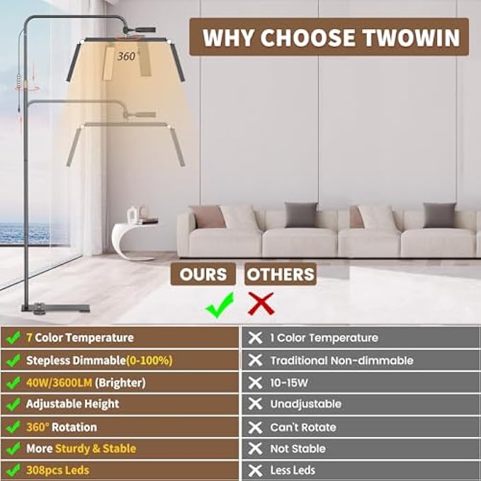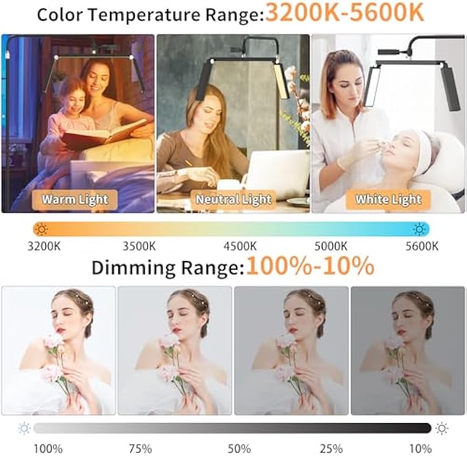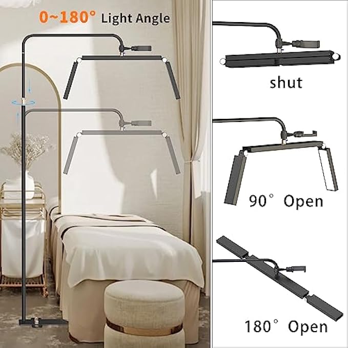 ✅【Versatile Eyelash Lamp】This eyelash extension light lamp is a highly functional lighting option that is perfect for various professionals. including eyelash, makeup artist , hair stylist , photographer etc. Perfect for makeup tutorial, videos shooting, live streaming, online teaching, all kinds of close-up photography and filming. Also used for studying, reading, working, and as basic lighting in the workspace. ✅【Adjustable Brightness & 7 Lighting Modes】In addition to adjust the brightness from 10% - 100% and the color temperature from 3200K - 5600K, you can also adjust the angle of the lash lights from 0 to 180°. The 360°rotatable lamp head of our lash light for eyelash tech allows you to control the light direction, providing bright, even lighting. The dimmable feature of the lash lamp allows for customizable brightness to ensure that your work environment is just right. ✅【Foldable Design】With stylish and modern design, our LED floor lamp is aesthetic and highly functional. The unique shape of the eyelash light made it perfect to spread the light 180°. The lash tech light also comes with a phone holder, 360° rotatable, allowing you to easily record your sessions. In addition, the stand can be adjusted between 57 inches and 70 inches. You can customize this eyelash lamp height to meet your every needs precisely. ✅【Nice Structure and Quality】This light for lash extensions has a heavy, sturdy base, which ensures that the lash light for eyelash extensions stays securely in place while you work. You won't have to worry about the lamp tipping over or becoming unstable, allowing you to focus on your work. ✅【Remote Function】Our light for lash extensions comes with a remote, you can adjust the color temperature and brightness without leaving the sofa or warm bed, more convenient for your work and life. space-saving, very easy to install. It is a best choice as a gift. also a perfect light lamp for personal or professional use. 1-year warranty. Have a try!