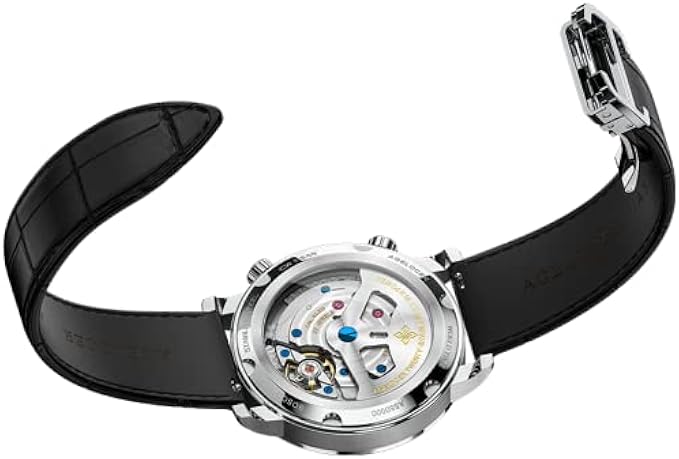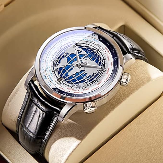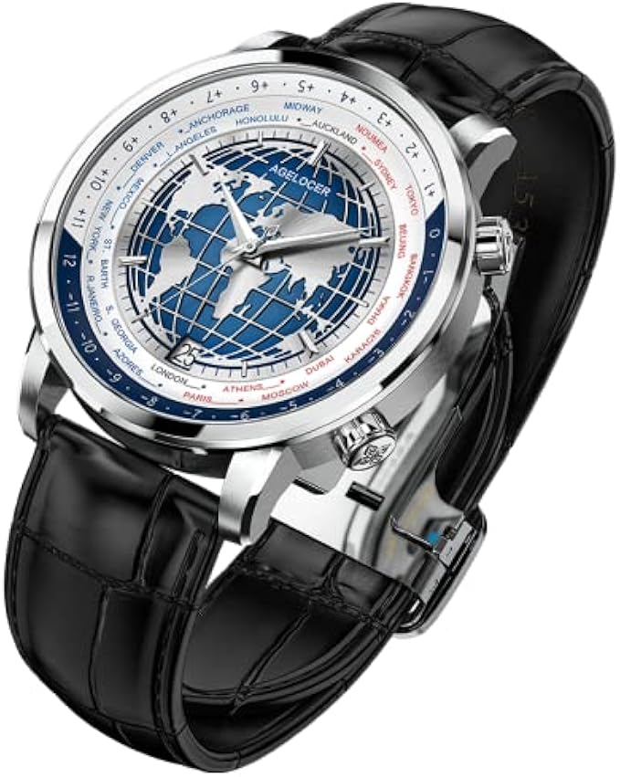 AGELOCER Mens Watches World Time Diamond Mechanical Calendar Luxury Waterproof Leather Watches for Men Blue