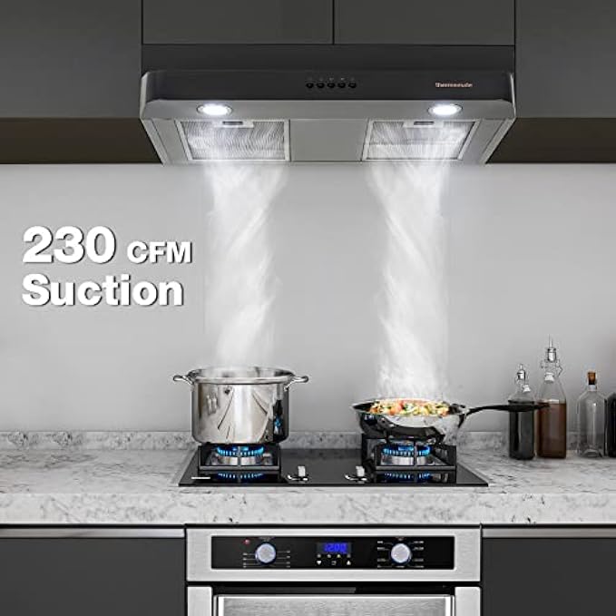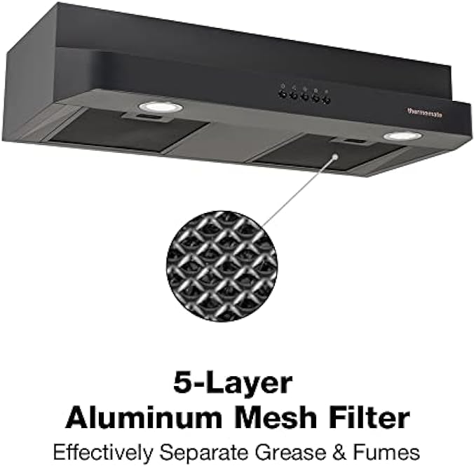 [Powerful Yet Quiet] thermomate slim vent hood with powerful exhaust fan provides max 230CFM air suction to effortlessly ventilate your kitchen, quickly remove cooking odors and smoke, 3-speed exhaust fan can be adapted to all cooking needs. What's more, the noise level is less than 65dB at high speed.