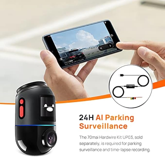 • 【24H AI Parking Surveillance & AI Motion Detection】 It also has a 24-hour parking monitor available on the dash cam to record continuously at parking mode. 70mai hardwire kit UP03 (ASIN:B0BW49PX9B) is customized for 24-hour auto-triggered parking surveillance, time-lapse recording. The exclusive AI Based Human Detection Algorithm prevents false triggers. It identifies approaching or retaining still suspiciousness more precisely then initiates a up to 30-second recording and keeps following.