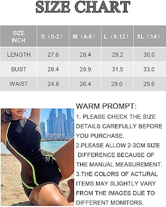 <li class="a-spacing-mini"><span class="a-list-item"> 80% Nylon, 20% Elastane </span></li> <li class="a-spacing-mini"><span class="a-list-item"> Imported </span></li> <li class="a-spacing-mini"><span class="a-list-item"> Elastic closure </span></li> <li class="a-spacing-mini"><span class="a-list-item"> Machine Wash </span></li> <li class="a-spacing-mini"><span class="a-list-item"> Fabric: This womens one piece outfits is made of 80% Nylon and 20% elastane. Made of high quality material, good elasticity and permeability, comfortable and durable for long time use. </span></li> <li class="a-spacing-mini"><span class="a-list-item"> Features:Zip front,Sleeveless,designful block color to accent hourglass figure, Comfortable and practical, allowing you to swim and snorkel in cool water without worrying about your clothes slipping off. Trendy one-piece swimsuit with delicate block color. </span></li> <li class="a-spacing-mini"><span class="a-list-item"> Colorful:This sexy one-piece swimsuit is very fashionable and chic with a variety of colors to match the one you like. </span></li><li class="a-spacing-mini"><span class="a-list-item">Occasion: This modest bathing suit for women is the best holiday gifts for Wife, Girlfriend.This swimwear is perfectly suitable for surfing, swimming, diving, wakeboarding, water yoga, beach pool party, summer vacation and other occasions.</span></li> <li class="a-spacing-mini"><span class="a-list-item">US Size: We have different US sizes available to you, S(US 4), M(US 8), L(US 12),XL(14) please read the size chart at the end of the picture carefully and choose the right size for you.Manual measurement may exist 1-1 cm difference.We are also developing more sizes so as to fit all body types.</span></li>