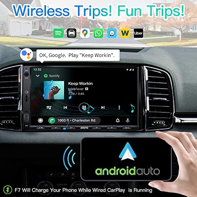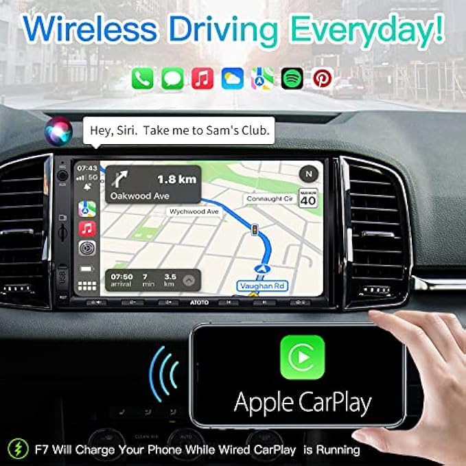 • 【Wireless CarPlay】F7 WE Double DIN head unit offers wired and wireless CarPlay. You can get directions from navigation apps like Waze, put on your personal playlist on Spotify, have Siri call a friend, etc. without even taking your iPhone out. Really convenient, not to mention safe. What a carefree driving experience! ATOTO proudly informs you that F7 car radio charges iPhone quickly while using wired CarPlay and supports running navigation in CarPlay while listening to FM/AM radio or USB music.