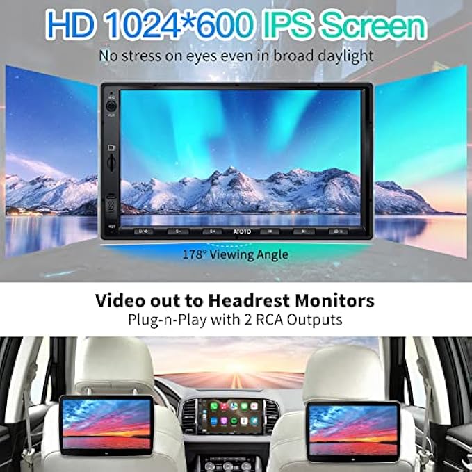 • 【IPS HD screen, Mirrorlink】IPS 1024*600 screen offers ATOTO's classic outstanding brightness. Never worry about not seeing clear navigation cues in the sun. With Mirrorlink, you can cast your phone's display to F7's car stereo have amazing screen, complementing CarPlay/Android Auto. Also play local media files and output to headrest monitors via 2 video out RCA jacks on the back. Reads external storage up to 2TB SSD and 512 GB SD card, ensuring enough space for videos and songs.