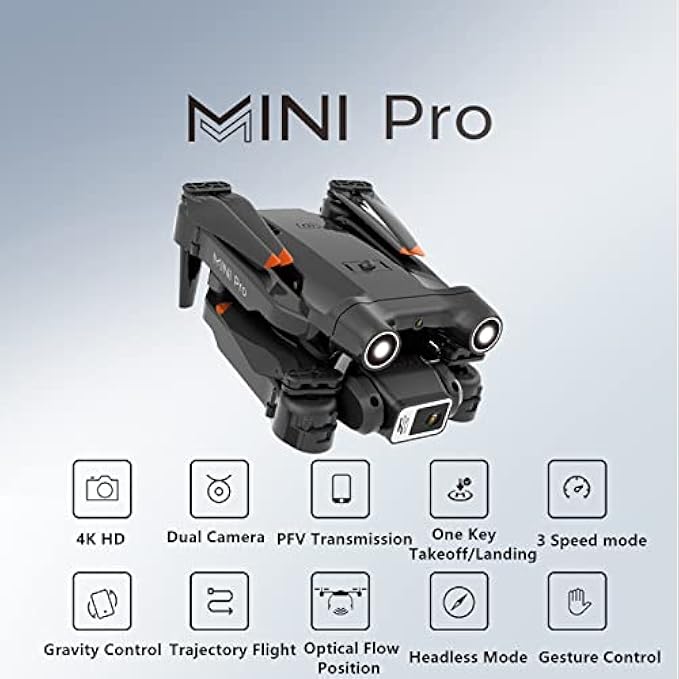 FPV ADJUSTABLE CAMERA Mini DRONE :You can take photo and videos through the dual 4K high quality cameras ,the front camera can be adjusted up and down 150°by remote control,gives you a wider breathtaking field of view from the 120°wide angle lens. With FPV transmission,you can see real time first-person-view on the App and share every wonderful moment on your social media anytime. 360° INTELLIGENT OBSTACLE AVOIDANCE: The drone for adults is equipped with infrared sensing system for front/rear/left/right obstacle avoidance function,when an obstacle is sensed during flight,the drone will auto-matically move in the opposite direction to avoid collision,allowing beginners to operate and learn with ease. OPTICAL FLOW POSITIONING :The technology of optical flow positioning makes the RC quadcopter hover more stably,and effectively prevent the picture from shaking when taking pictures and video. Ultra-clear picture quality is under control.Combined with the function Altitude Hold Mode, you can lock the altitude and position more accurately. It's the perfect combination for beginners. DRONES CORE FUNCTIONS: Smart hover,Gesture photo,Beauty filter,Altitude hold,the aircraft can be folded, six pass with gyroscope,3D flip,Headless mode,Voice control,Trajectory flight,multiple functions bring you endless fun. FLIGHT TIME: The drones 2 batteries,flight time is about 15 minutes per battery.Modular batteries are easier to install and safer to use.In addition to operating the drones with camera through the remote control, you can also operate it on the APP,which is convenient,fast and fun. SIMPLE OPERATION: One key to take off/landing,three speeds adjustable,more suitable for adults kids beginners. Reading the instruction manual can fully understand the functions and usage of the camera drone.
