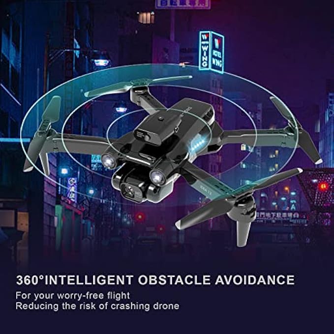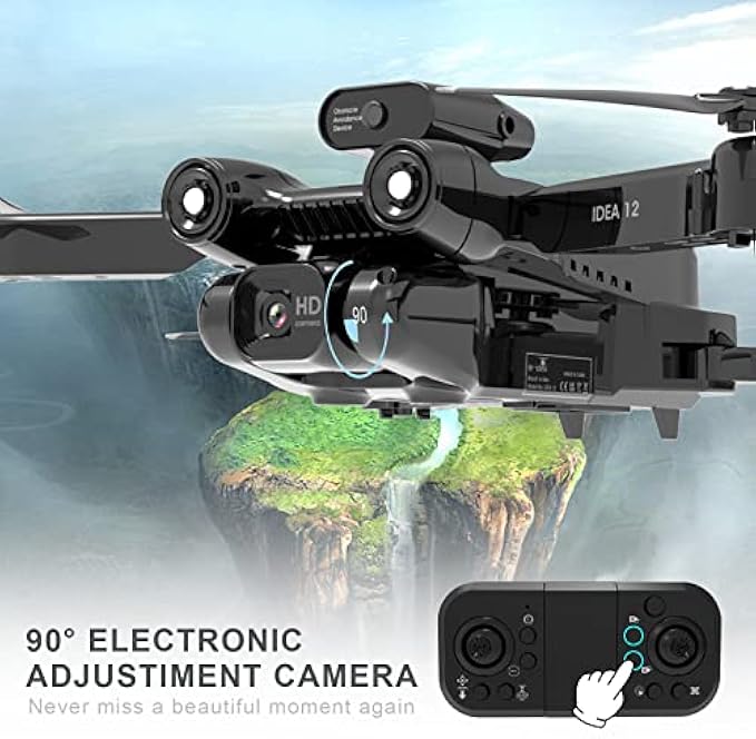 • ?【Drone with 360° Obstacle Avoidance Camera】IDEA12 drone is equipped with a 360° intelligent obstacle avoidance lens. When switched to obstacle avoidance mode, the drone intelligently detects obstacles in flight and will sound an alarm when it encounters an obstacle and immediately stop flying towards it, avoiding obstacles in all directions and reducing the risk of collision, providing you with a worry-free flight.