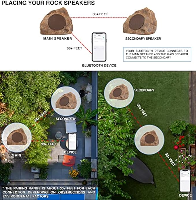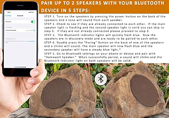 BLUETOOTH 5.0 – The speaker can be paired via Bluetooth with a range of about 30+ feet depending on obstructions and environmental factors. With just a touch of a button connect your Bluetooth enabled device and listen. Add a 2nd Homewell Rock Speaker for a more immersive experience.