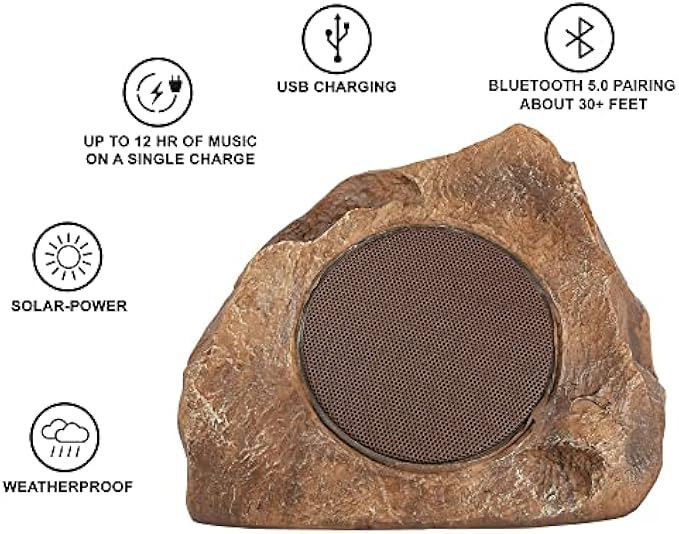 Homewell Outdoor Rock Speaker Solar-Powered Wireless Bluetooth 5.0 Portable Speaker Weatherproof for Patio, Pool, Deck, Yard, Garden and Home (2-Pack, Brown)
