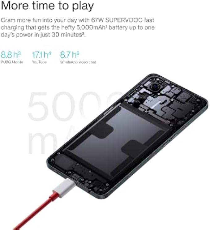 • 50W SUPERVOOC Endurance Edition + 5,000 mAh Battery - A day's power in just 30 minutes. SUPERVOOC Endurance Edition charging and Battery Health Engine technology increase the battery's lifespan and prevent over-charging.
