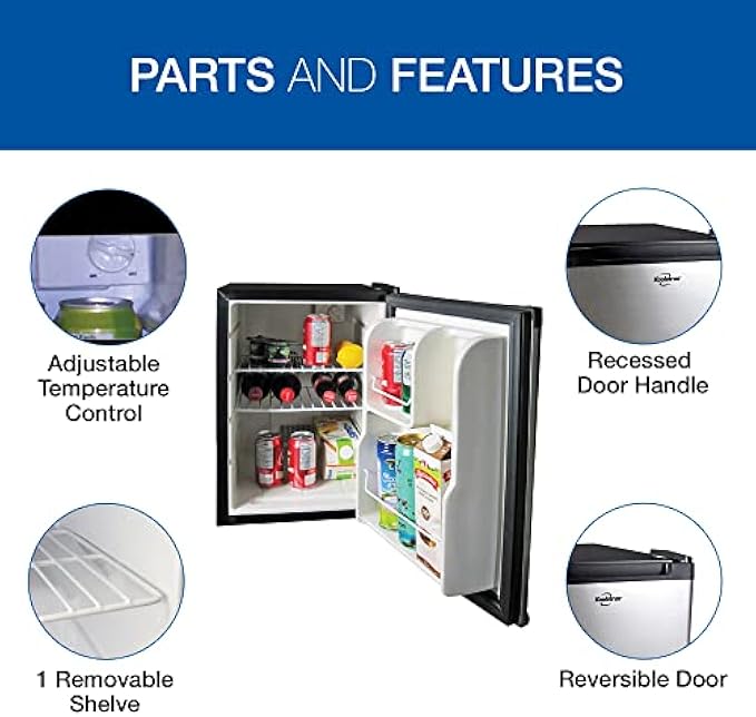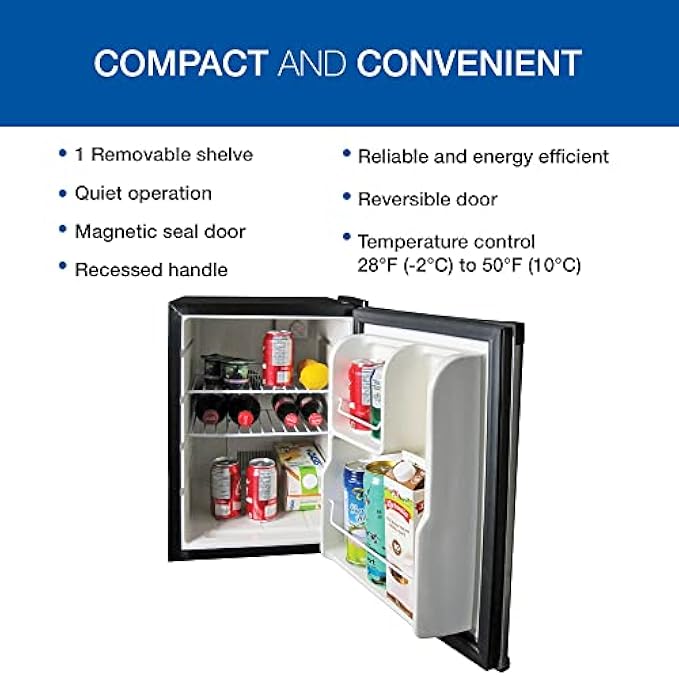 • COMPACT AND CONVENIENT Mini fridge with recessed door handle and space-saving flat back design designed for 15” cabinet openings has room to keep all your favourite snacks, soda, and beer right at hand in your den, home bar, or games room