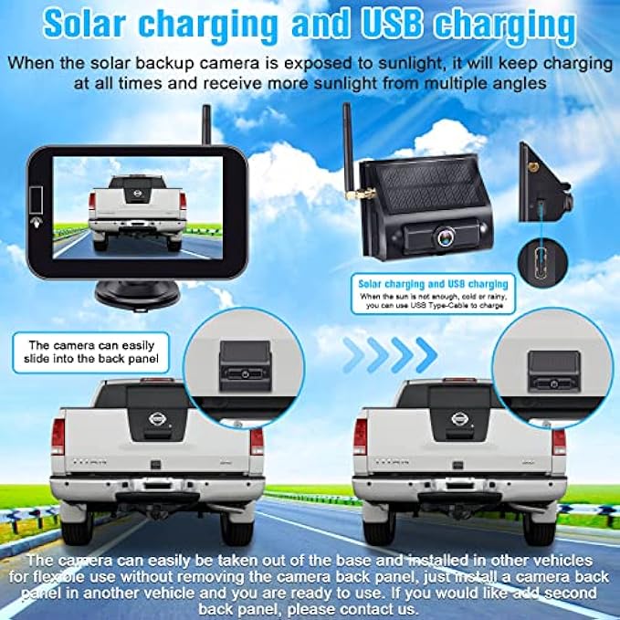 • 【Solar Powered Portable Rechargeable Camera】 ►Backup camera wireless with powered solar panel,rechargeable during sunny days when driving.It uses a separating bracket for more flexible mounting installation.The camera can be removed from the bracket at any time easily,you can power the camera through the USB port in winter or in times of lack of sunlight.