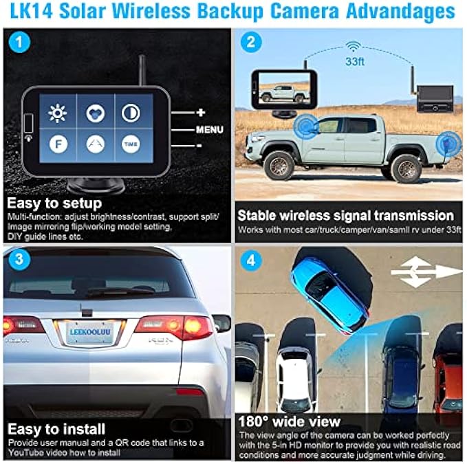 LeeKooLuu Solar Wireless Backup Camera HD 1080P Rechargeable System 5'' Monitor 3 Mins Installation for Car Truck Camper Small RV Hitch Rear View Camera LK14