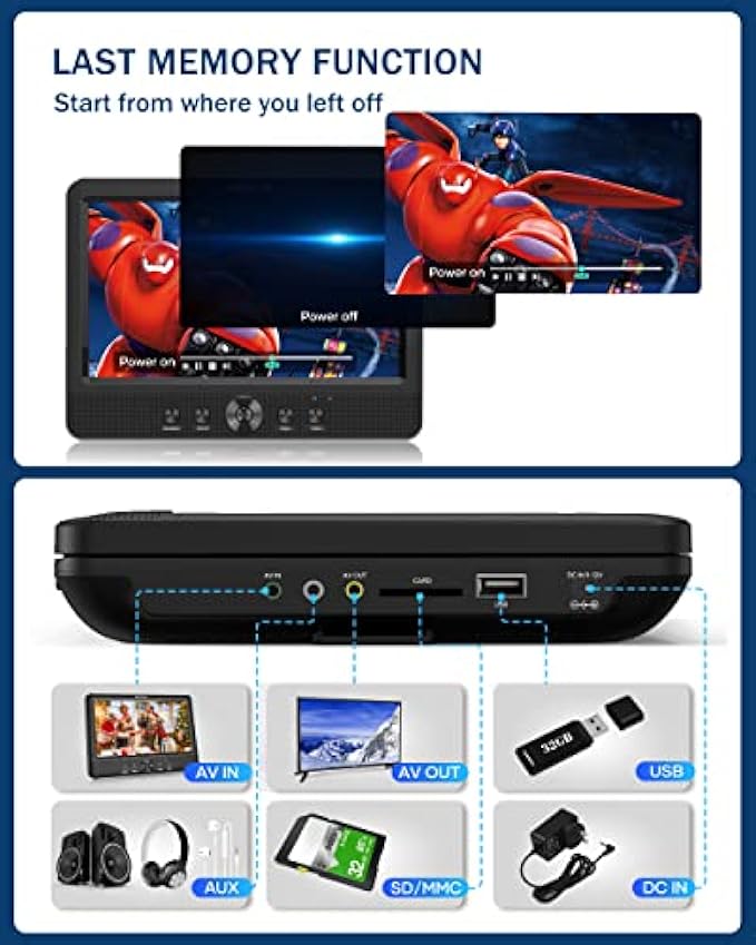 • ??【???? ??????&???? ??????】Euipped with AV Out port on each unit and supplied with RCA cable, allow you to sync the screen from dvd player to your home TV to enjoy movie with your families easily. The dual car headrest video players will still record your last playback position even after it is turned off, you will always start playback where you left off. You don't need to worry about the movie not being able to pick up the last played plot