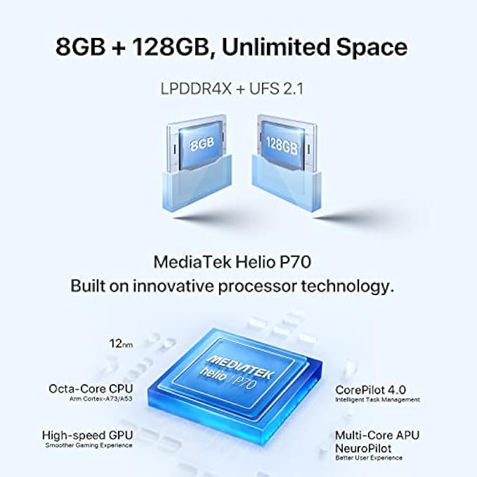 • 【MediaTek Helio P70 Qcta-Core Processor & 8GB + 128GB】 UMIDIGI F3 smartphone built on innovative processor technology, the MediaTek Helio P70 enables more powerful performance, longer battery life, fantastic photography, smooth gaming and a masterful multi-core AI. The 8GB + 128GB super memory combo, with LPDDR4X + UFS 2.1, is powerful enough to handle any heavy app and provides plenty of space for your videos and photos.