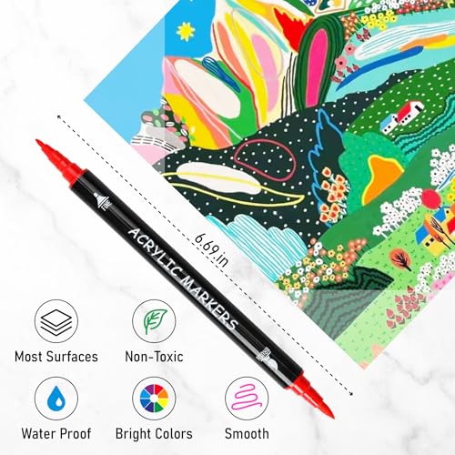 【Precision and Versatility in Every Stroke】 The 30-color acrylic paint markers feature dual tips for ultimate control and flexibility. The fine tip (1mm) is perfect for sharp lines, lettering, and detailed designs, while the brush tip (1-5mm) offers bold strokes and the ability to create various textures with ease. Perfect for everything from sketches to large-scale artwork.
