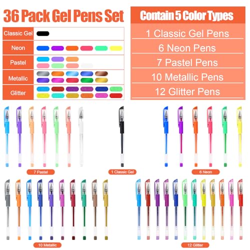 36 Premium Quality and Vibrant Colors Gel Pens: Including 12 glitter pens, 10 metallic pens, 7 neon pens, 6 pastel pens, 1 classic pens. 40% more ink for long lasting, will surely make you feel like a professional artist.