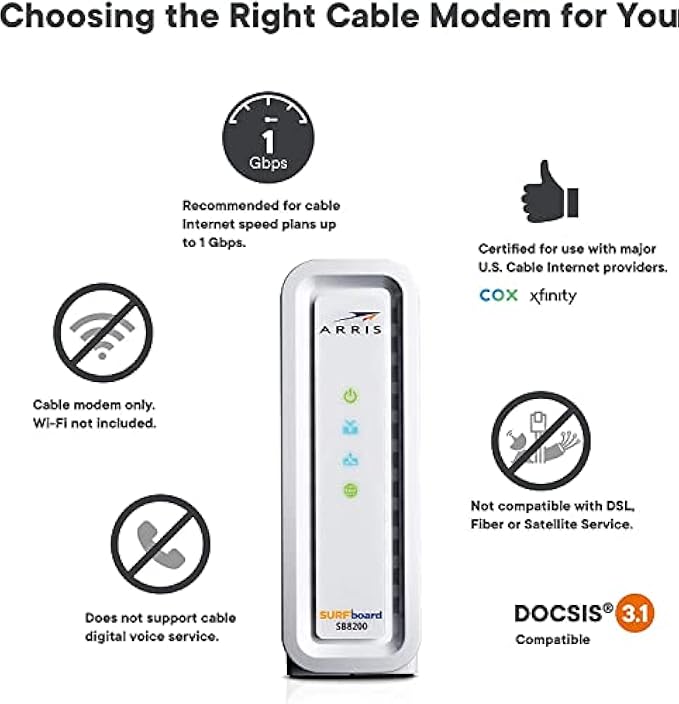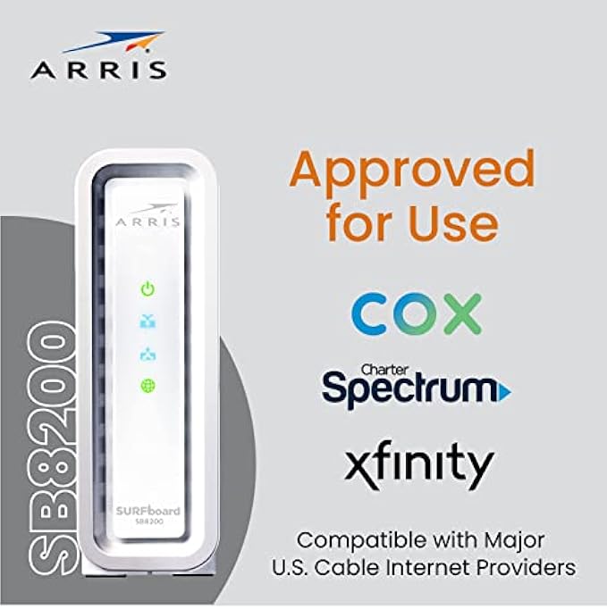 • Compatibility: The SURFboard SB8200 is compatible with major U.S. cable internet providers including Cox (Gigablast), Spectrum (Internet Gig), Xfinity (Blast!/Extreme Pro) and others. It's approved for cable internet speed plans up to 1-Gbps. Check your Internet Service Provider (ISP) website to confirm compatibility.