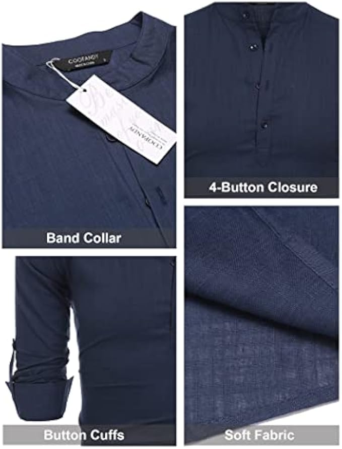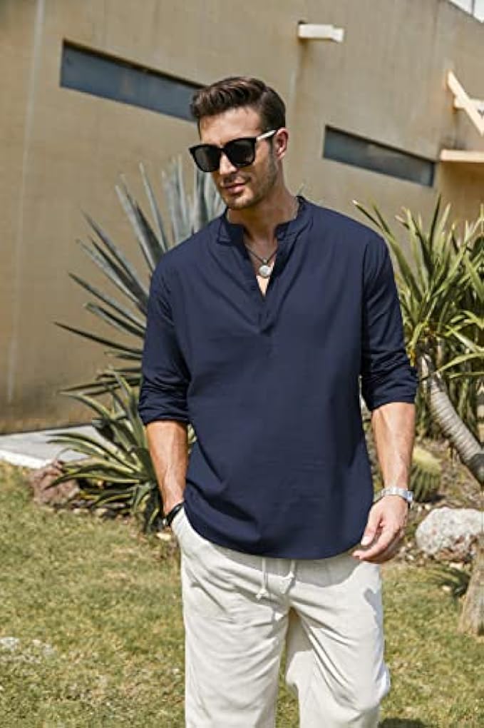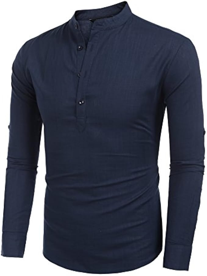 <li class="a-spacing-mini"><span class="a-list-item"> Cotton and Linen </span></li> <li class="a-spacing-mini"><span class="a-list-item"> Imported </span></li> <li class="a-spacing-mini"><span class="a-list-item"> Button closure </span></li> <li class="a-spacing-mini"><span class="a-list-item"> Machine Wash </span></li> <li class="a-spacing-mini"><span class="a-list-item"> 【HIGH QUALITY FABRIC】: This linen shirts made from great fabric, lightweight, breathable and soft touch, do not shrink and fade, moisture-wicking. </span></li> <li class="a-spacing-mini"><span class="a-list-item"> 【STYLISH DESIGN】: Casual henley neck shirts, stand collar, simple style, solid color, slim fit, long sleeve(Roll-up), button-down closure, rounded hem, featured button detail. </span></li> <li class="a-spacing-mini"><span class="a-list-item"> 【CLOTHING MATCH】: These long-sleeve stylish slim fit shirts could be easy to match with dress pants, slacks, chinos, and jeans. </span></li><li class="a-spacing-mini"><span class="a-list-item">【OCCASION】: Perfect for spring, autumn and summer, fashion style, formal work, business wear, everyday casual wear, beach wear and etc.</span></li> <li class="a-spacing-mini"><span class="a-list-item">【SUGGESTION】: Machine washable. Please refer to our size chart picture before ordering, thanks in advance.</span></li>