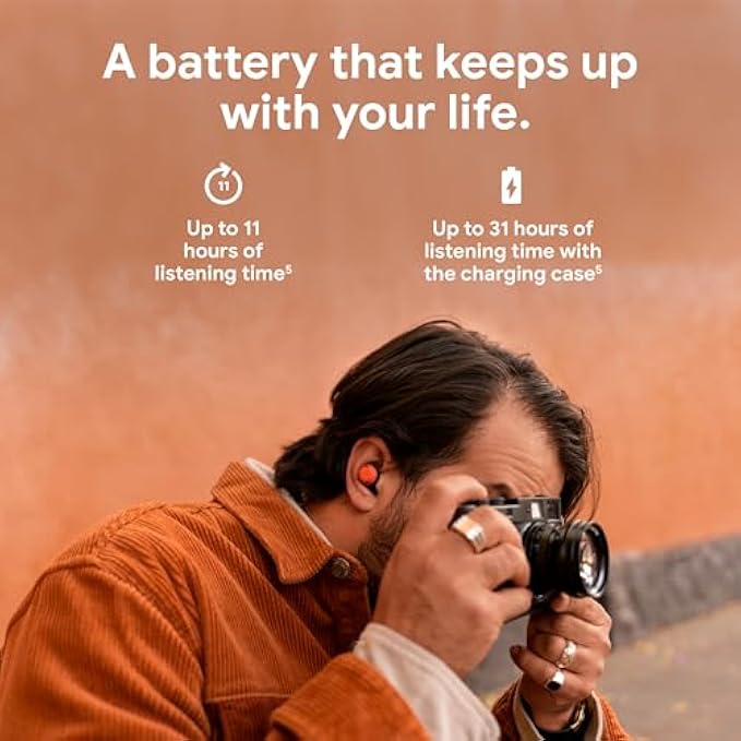 • The battery keeps up with your life, with up to 11 hours of listening time, or up to 31 hours with the charging case[5]; you can charge them wirelessly with Pixel Stand or other Qi-certified chargers[6]