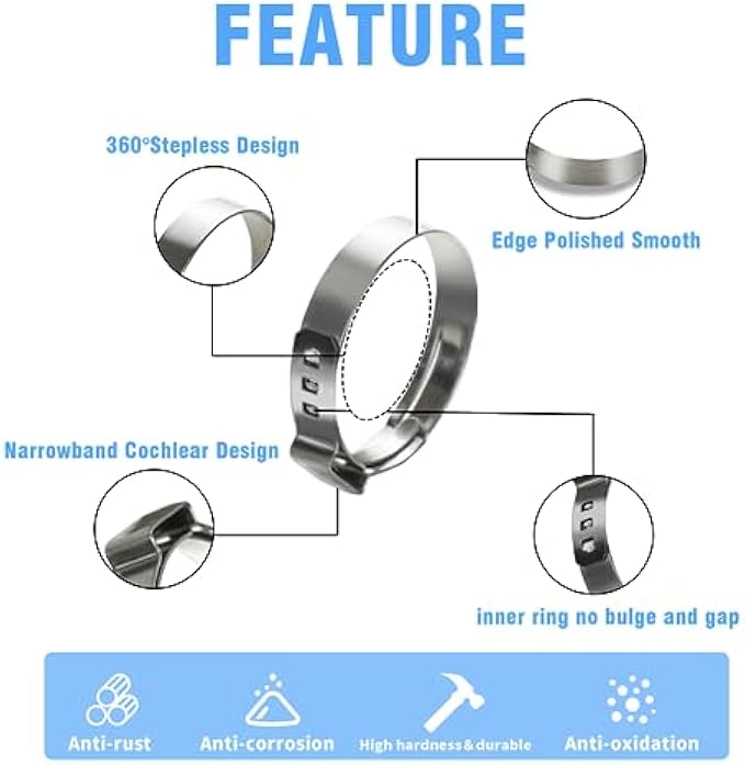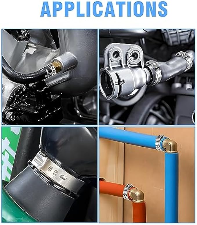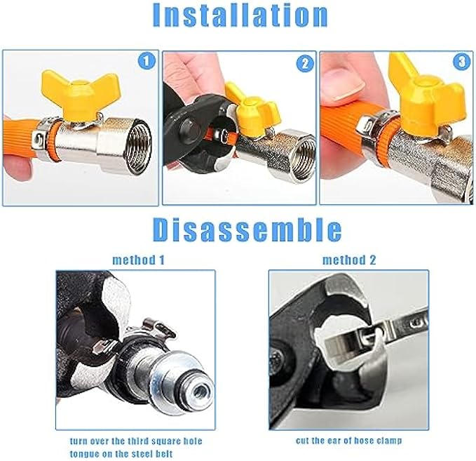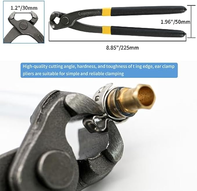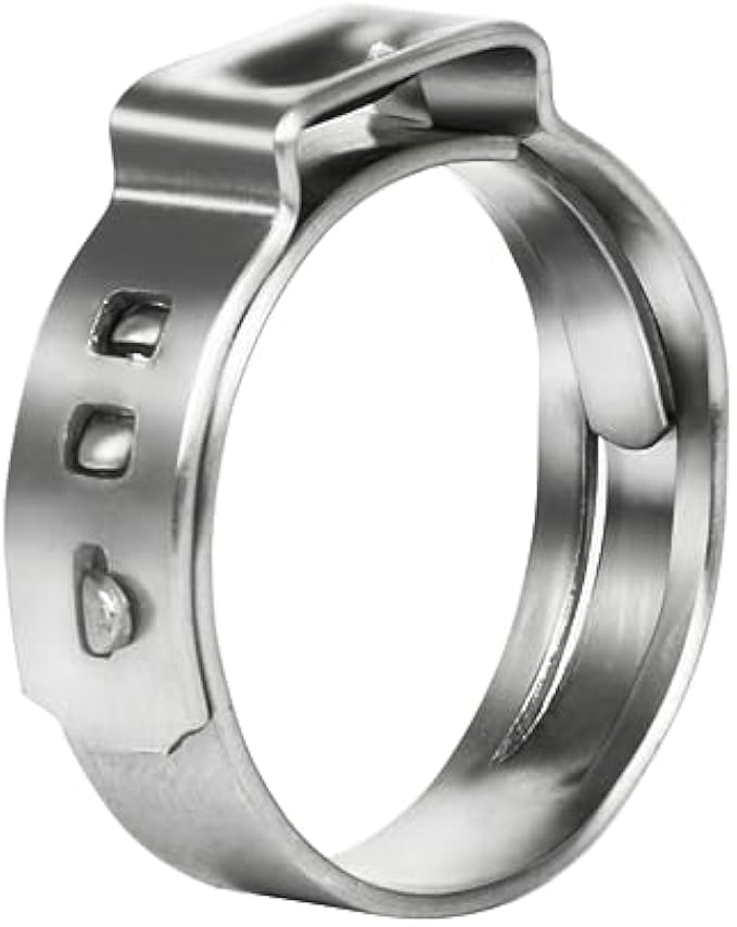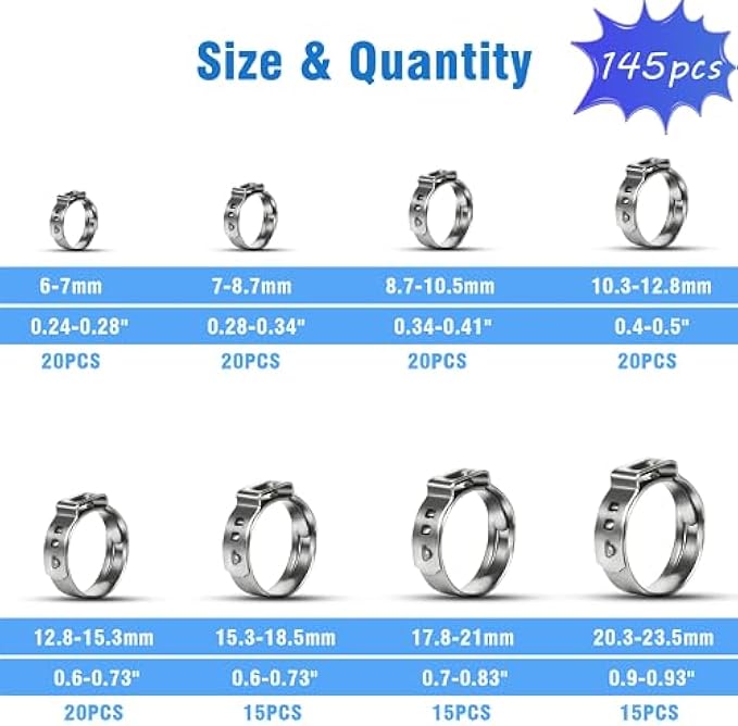 [Include Size] This single ear hose clamps kit have 8 common sizes: 7mm, 8.7mm, 10.5mm, 12.8mm, 15.3mm, 18.5mm, 21mm, 23.5mm, all size of tube clamp packed in a sturdy convenient case, can be used for a storage box. [Premium Quality] High precision single ear stepless hose clamps are Made of 304 Stainless Steel, has good corrosion resistance, heat resistance, low temperature strength and mechanical properties, a good choice for long-term use.hose clamps are used to seal various types of hoses. [Ear Clamps Pliers] Equipped with 1 ear clamps pliers, non-slip rubber handle, Great length on handles, strong and well built. using the proper matching plier, these clamp can be equipped fast and will hold very well, which saves your time efficiently; Multi size pack is handy to have for your projects & repairs. [360°Stepless Seal] Narrow band design providing a more concentrated sealing pressure; The cochlear design provides a powerful thermal expansion compensation function, which compensates the dimensional change of the pipe due to temperature changes, so that the tube is always in a well sealed and fastened state. [Application] Widely applications in all plumbing system - Hydronic heating system, air condition system, water heater, Telecommunications electrical plumbing, food pipeline system etc. Providing a strong and reliable crimp fitting application.