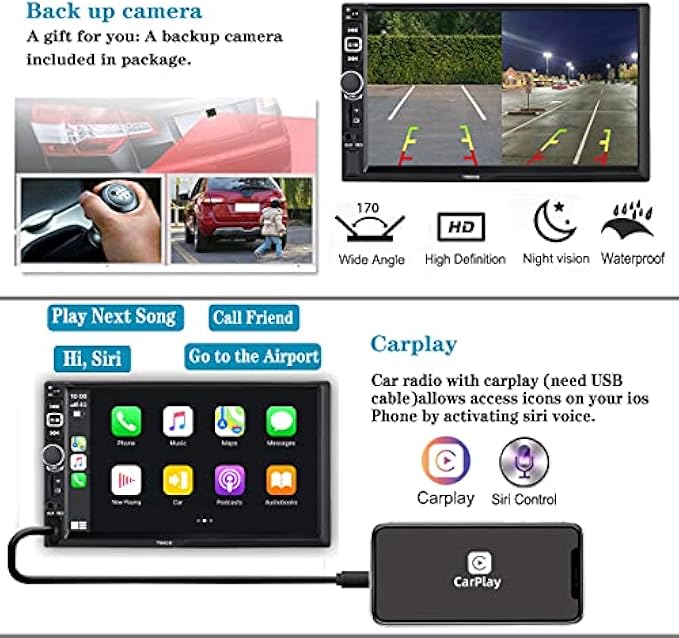 • 【Rear View Camera】Our apple carplay double din car audio receivers equipped with an HD camera, after connected with the rear camera, you can see the video on the radio screen through the rear view camera when reversing your car. The 7-inch touch screen will automatically display the reverse image once you pull in reverse. Make your daily reversing safer.