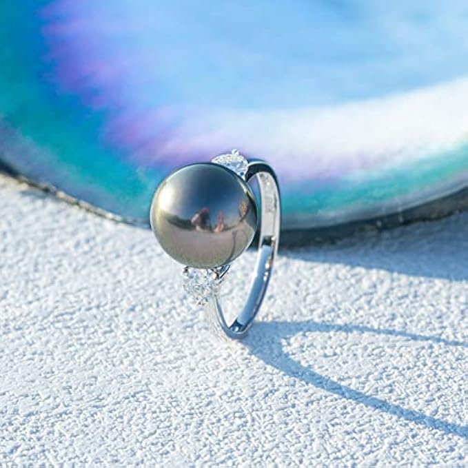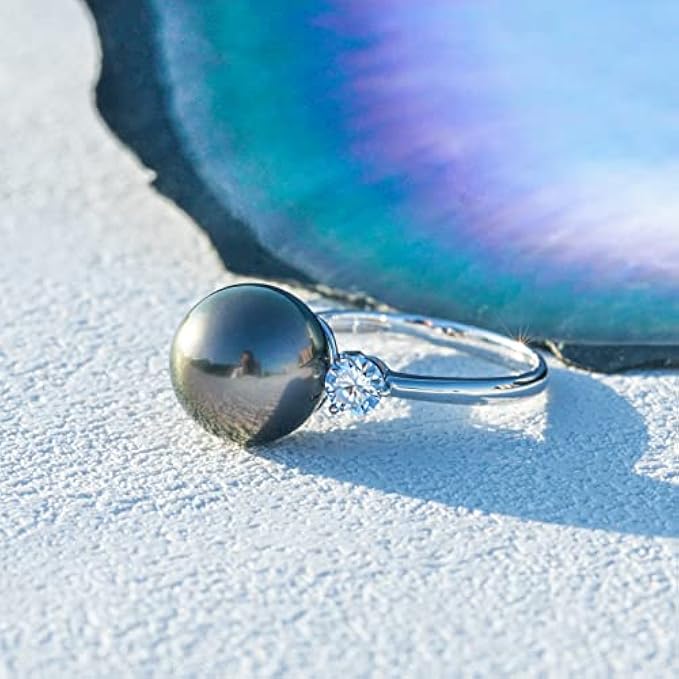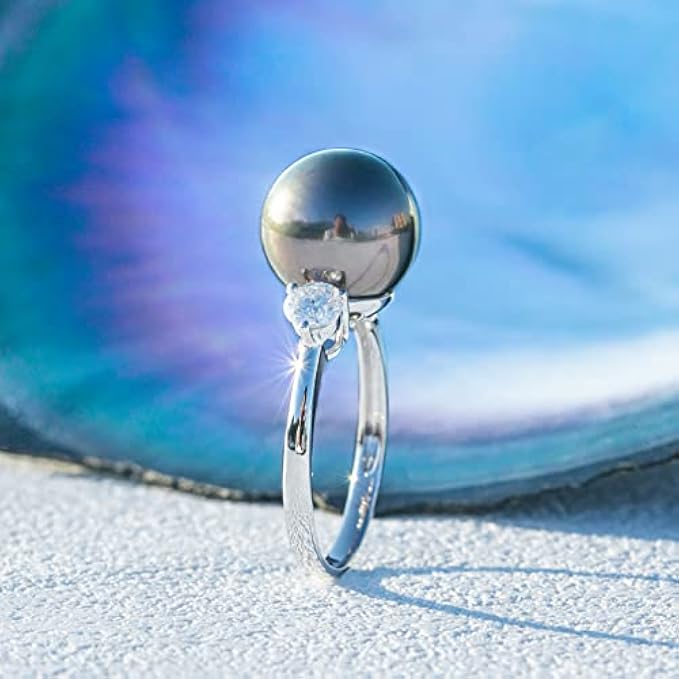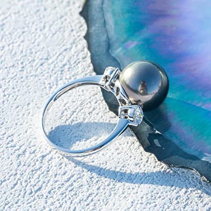 Genuine 10-11MM Tahitian Black Pearl 10K Ring, AAAA Quality Handpicked Nature Pearls with 0.6 cttw Moissanite in 10K Solid White Gold Ring