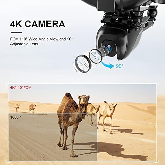 4K Camera and 5G Wi-Fi FPV: 4K Camera with FOV 110° wide-angle and 90° adjustable makes it possible to capture high resolution pictures and retain the most original details. 5G WiFi FPV transmission delivery a incredible clear and stable videos without delay.