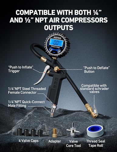 ALL-IN-ONE FEATURES: AstroAI tire pressure gauge Includes straight locking chuck, gauge, hose, and bleed valve, all in one unit with function of deflation, inflation(connect to an air compressor), tire pressure check.