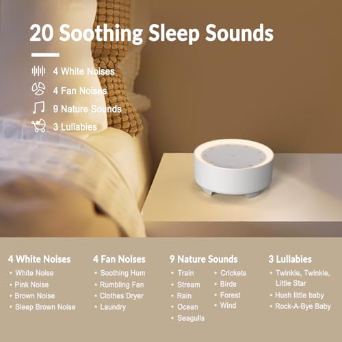 High-Fidelity Soothing Sounds: Features 20 high-fidelity soothing sounds including 4white noises, 4 fan noises, 9 nature sounds, and 3 lullabies. You can choose your favorite sound by simply tapping the sound name. Perfect for babies, and adults help you relieve the stress at home or office.